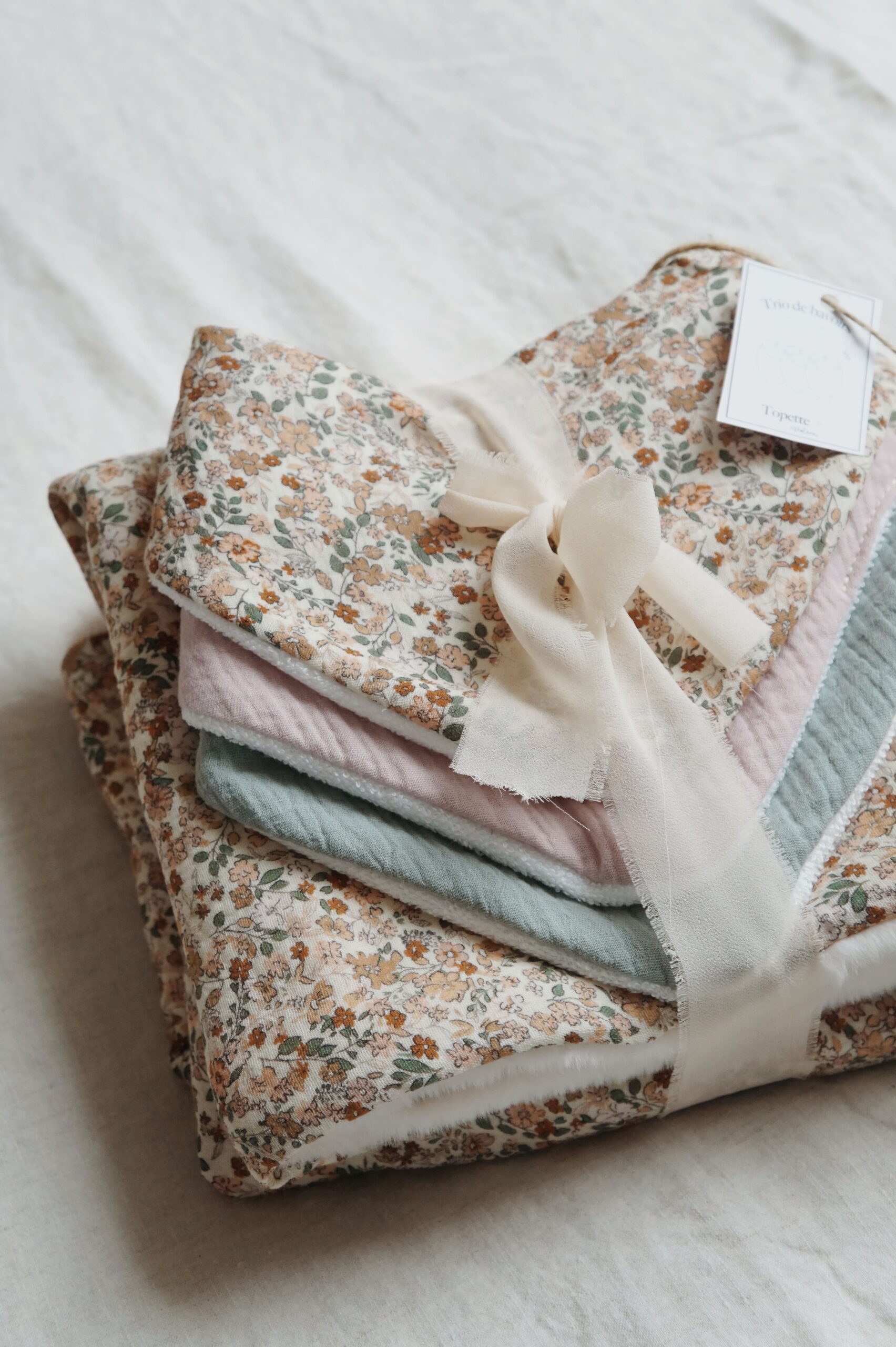 Offrez à bébé tout le confort nécessaire dès ses premiers mois avec notre Pack Mes premiers pas. Un pack pensé pour une combinaison parfaite entre douceur, utilité et style. Ce pack naissance regroupe deux essentiels du quotidien : une couverture en gaze de coton et un trio de bavoirs assortis. Un indispensable pour accompagner les premiers instants de bébé tout en facilitant le quotidien des parents.